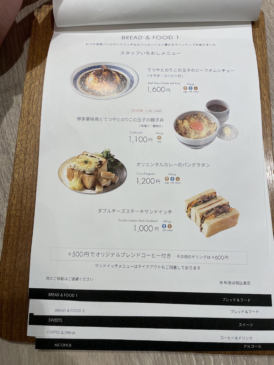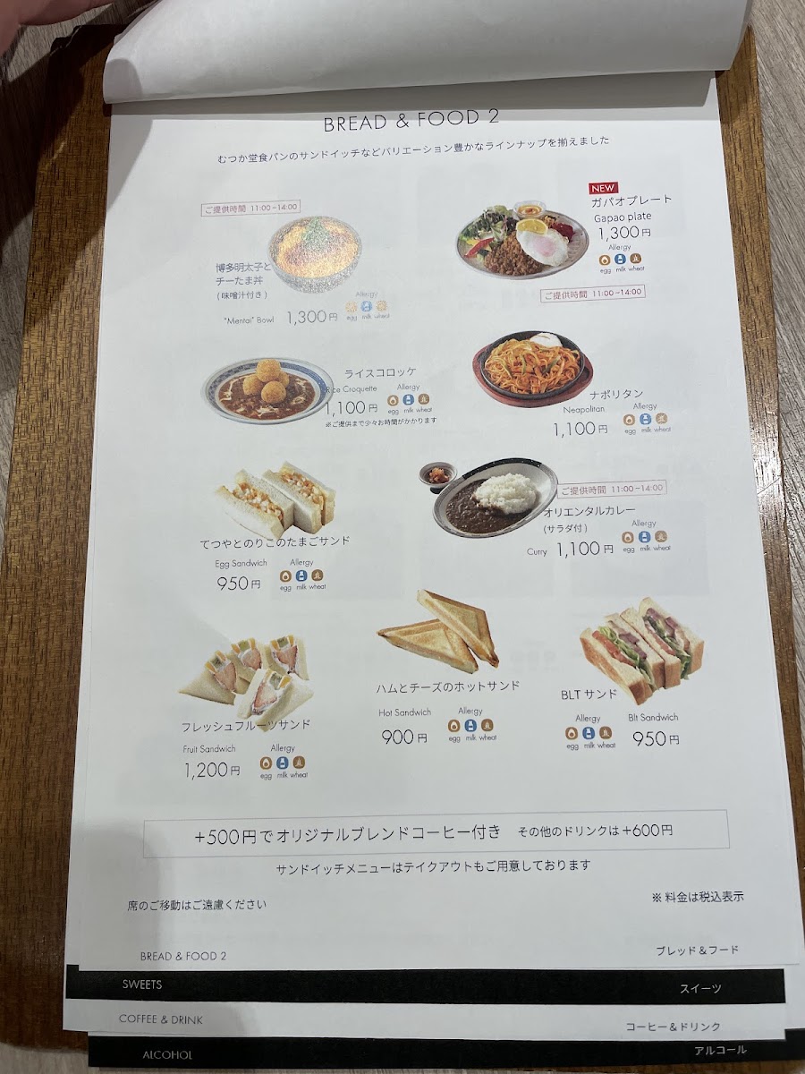 The food selection includes signature items such as the ガパオプレート—a Thai-inspired dish featuring aromatic spices and chili—and classic sandwiches like the BLT sandwich with thick-cut bacon, lettuce, and tomato served on specialty bread. Other savory options include rice croquettes and curry dishes, providing a range of flavors for casual meals.