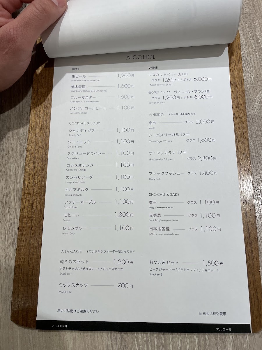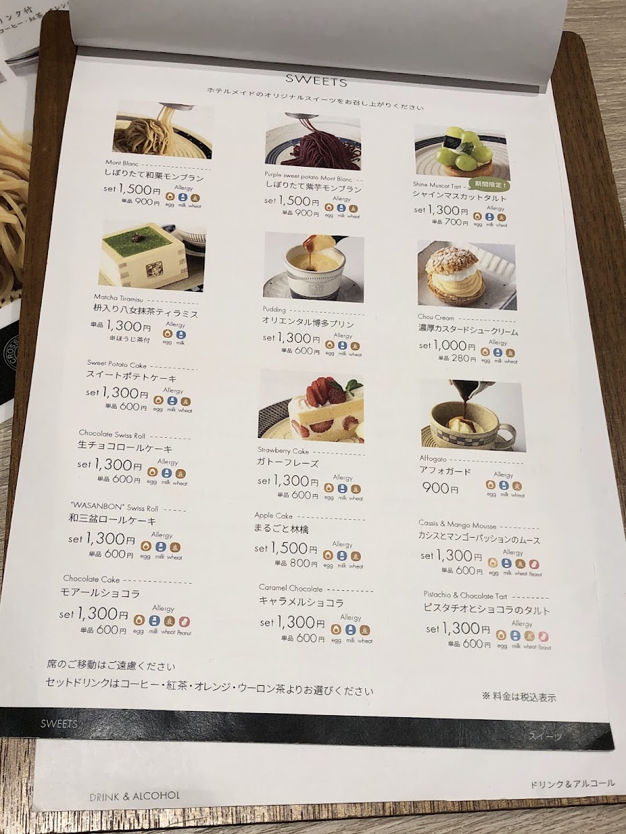 For dessert, the menu highlights several Mont Blanc variations, including freshly squeezed chestnut and pistachio versions, as well as baked cheese tarts, puddings, fruit sandwiches, and seasonal shaved ice made with Yame matcha. These desserts cater well to those seeking a sweet treat alongside their drinks.